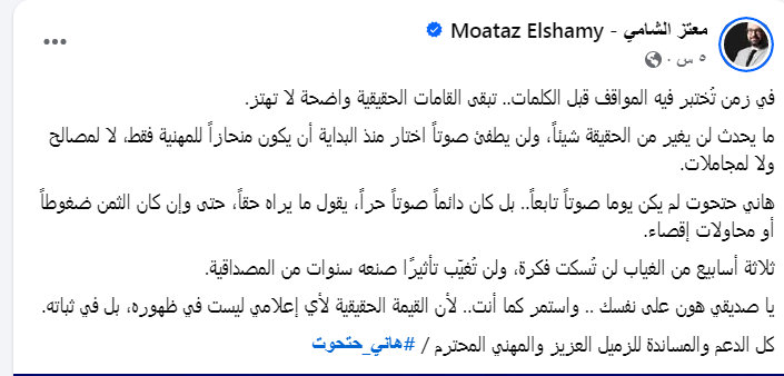 حرص الناقد الرياضى معتز الشامى على دعم الاعلامى هانى حتحوت بعد قرار إيقافه.