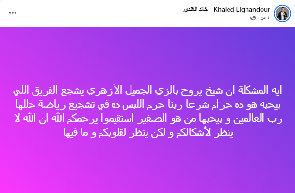 ايه المشكلة ان شيخ يروح بالزي الجميل الأزهري يشجع الفريق اللي بيحبه هو ده حرام شرعا ربنا حرم اللبس ده في تشجيع رياضة حللها رب العالمين و بيحبها من هو الصغير.