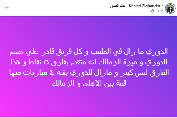 ويتبقى 4 جولات على انتهاء الموسم والزمالك متصدر بفارق 5 نقاط، ليعلق الغندور على شكل المنافسة.