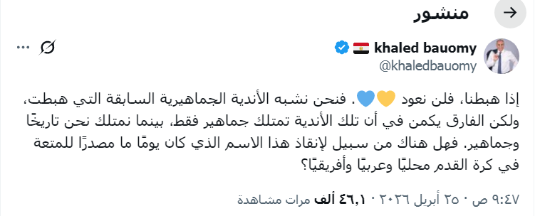 إذا هبطنا، فلن نعود. فنحن نشبه الأندية الجماهيرية السابقة التي هبطت، ولكن الفارق يكمن في أن تلك الأندية تمتلك جماهير فقط، بينما نمتلك نحن تاريخًا وجماهير.