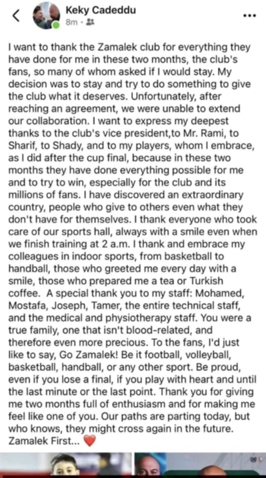 وقال كيكي في رسالته إنه ممتن للفترة التي قضاها داخل النادي، موجهاً الشكر للمسؤولين واللاعبين على دعمهم، كما أشاد بتجربته في مصر، مؤكداً أنه اكتشف بلد مميز وشعب كريم.