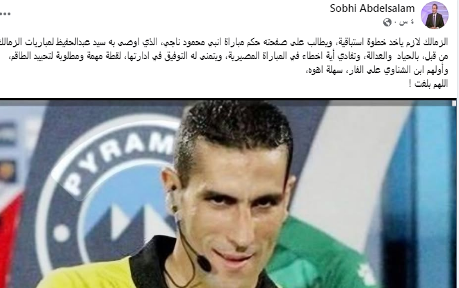 الزمالك لازم ياخد خطوة استباقية، ويطالب على صفحته حكم مباراة انبي محمود ناجي، الذي اوصى به سيد عبدالحفيظ لمباريات الزمالك من قبل، بالحياد والعدالة، وتفادي أية اخطاء في المباراة المصيرية