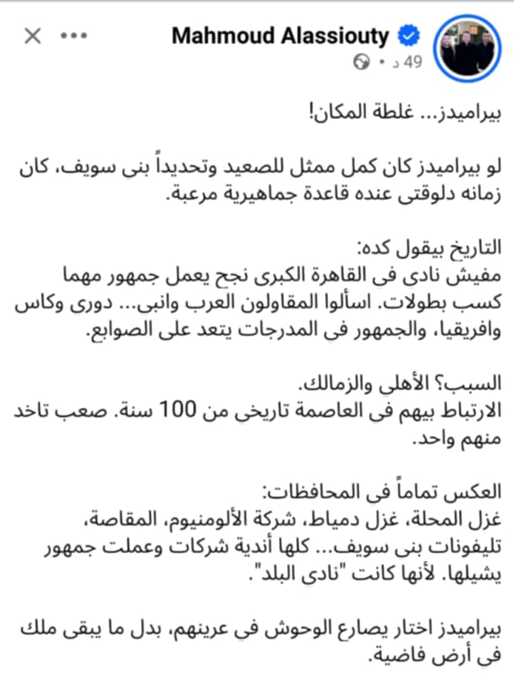محمود الاسيوطى اكد ان غلطة بيراميدز هو المكان، بعد تغيير إسمه من الاسيوطى الى بيراميدز، وتواجده فى القاهرة بعيداً عن أى حاضنة شعبية له.