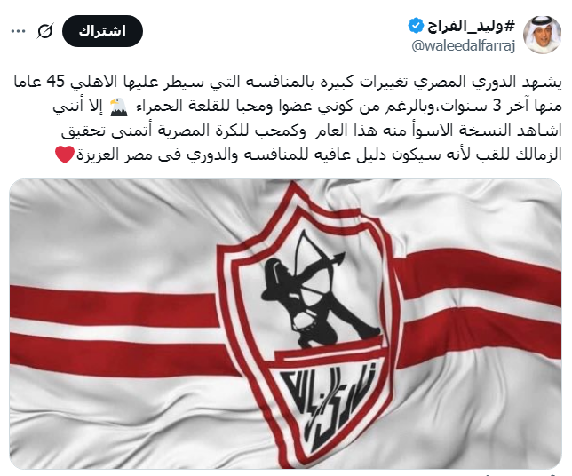 تمنى الإعلامي السعودي وليد الفراج تتويج نادى الزمالك ببطولة الدورى العام هذا الموسم.