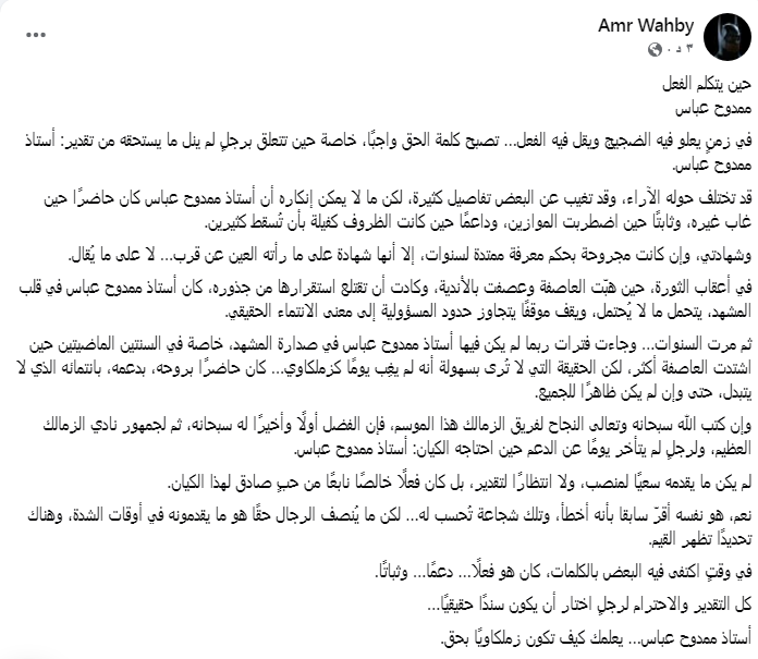قد تختلف حوله الآراء، وقد تغيب عن البعض تفاصيل كثيرة، لكن ما لا يمكن إنكاره أن أستاذ ممدوح عباس كان حاضرًا حين غاب غيره، وثابتًا حين اضطربت الموازين، وداعمًا حين كانت الظروف كفيلة بأن تُسقط كثيرين.