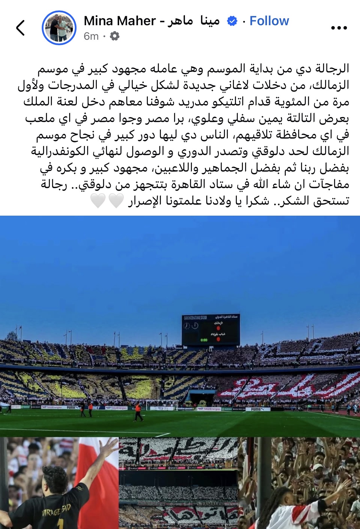 أثنى مينا ماهر على الدور الكبير الذي لعبته جماهير الزمالك طوال الموسم الحالي