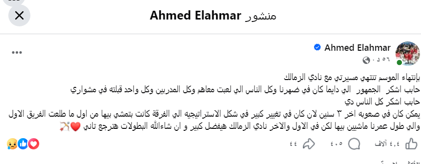 وعبر صفحته الشخصية على موقع التواصل الاجتماعى فيس بوك كتب أحمد الأحمر معلناً :